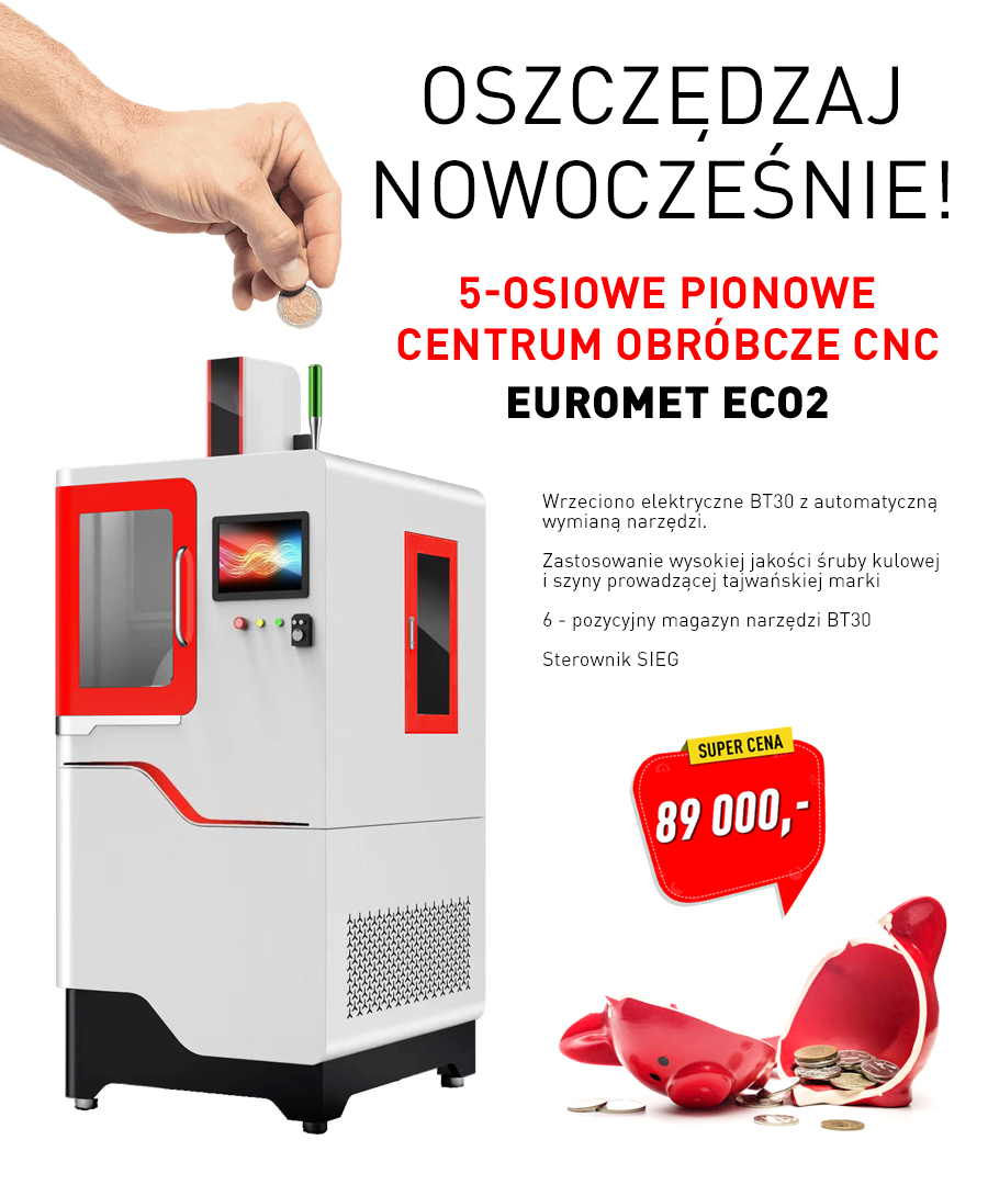 W naszej ofercie pojawiła się najświeższa nowość w postaci 5-osiowego pionowego centrum obróbczego cnc. Model EUROMET ECO2 nie tylko z uwagi na bardzo korzystne parametry techniczne (więcej informacji pod tym linkiem) w nowoczesny i przemyślany sposób pozwala na ogromne oszczędności. Super atrakcyjna a zarazem niska cena 89 000 zł netto jest kolejną zaletą przy właściwym wyborze w natłoku wielu maszyn na rynku obrabiarek.