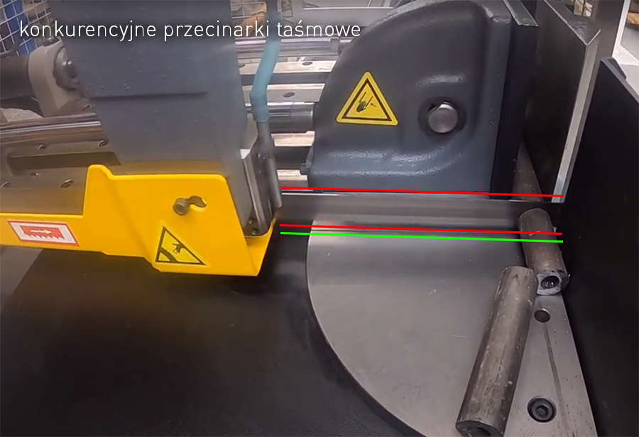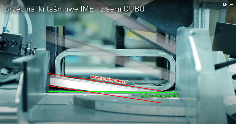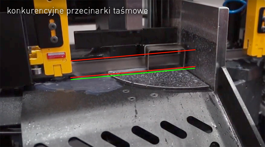Taśma w końcowym etapie cięcia jest pochylona względem płaszczyzny podstawy imadła. Dzięki takiemu rozwiązaniu skracamy czas cyklu cięcia oraz zwiększamy żywotność narzędzi (np. podczas cięcia profili o przekroju kwadratowym).