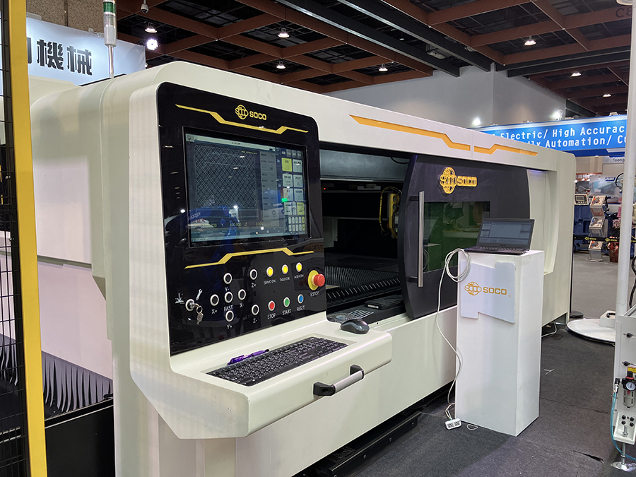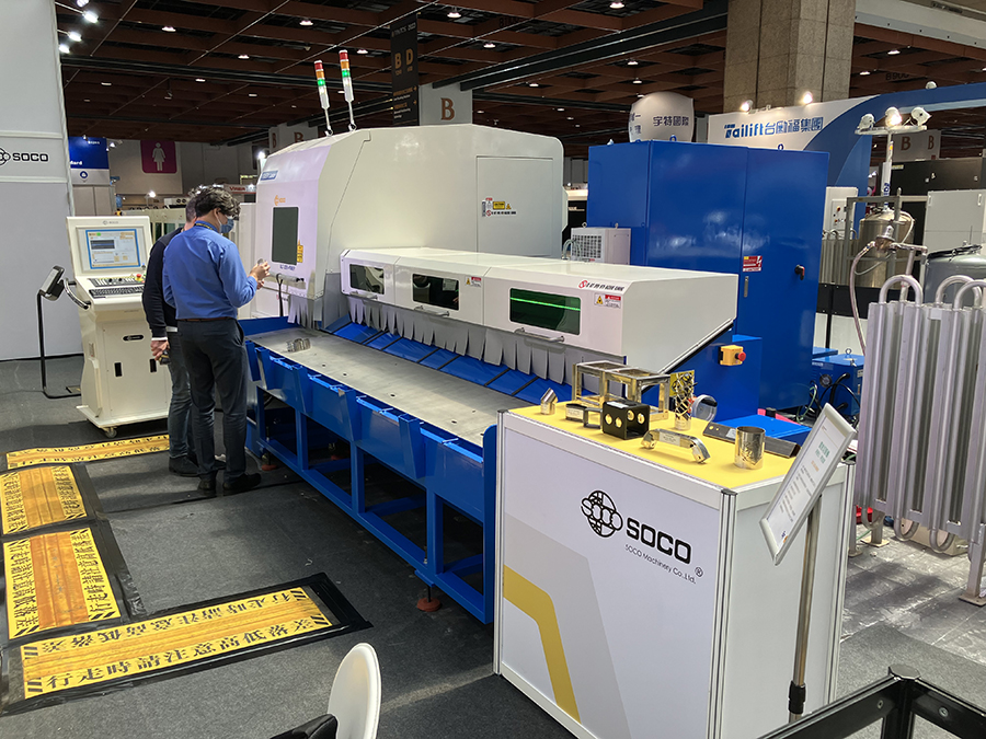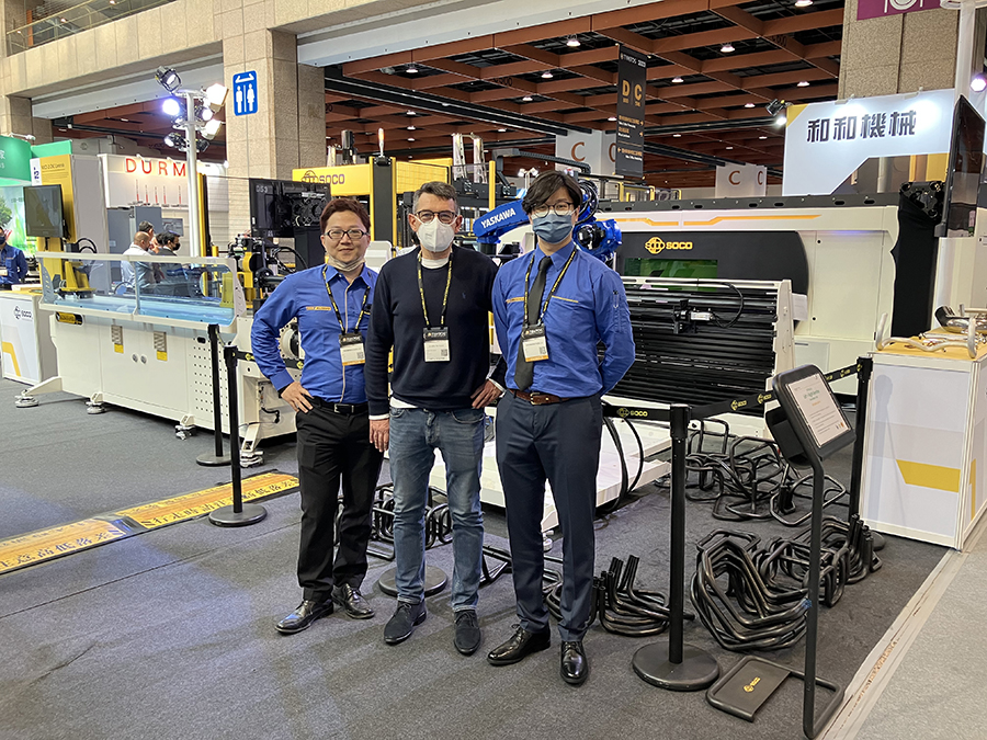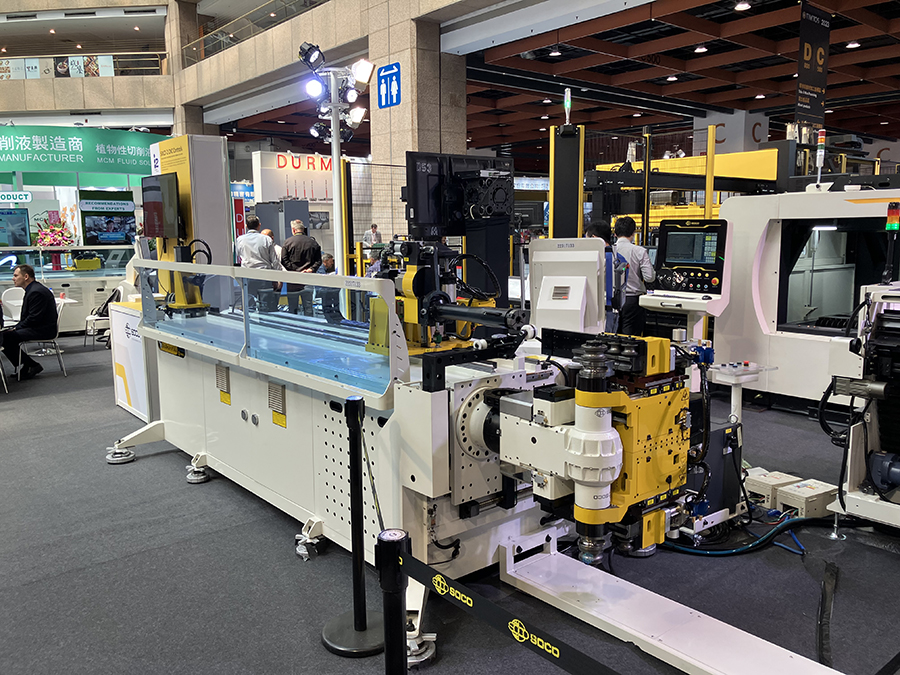 Na rozległym stoisku w samym środku hali nr 1, firma SOCO (producent giętarek do rur, prętów i profili oraz maszyn wycinających laserowo w blachach oraz rurach) przygotowała kompleksowy zestaw maszyn dla odwiedzających. Olbrzymim zainteresowaniem cieszył się model giętarki do rur SB-32x9A-2S-V-U, wyposażony w robota i podajnik (ROBOT-BTM-2-46+SDO). Maszyna charakteryzuje się głowicą pracującą w obu kierunkach (lewo/prawo). Oprócz praktycznych walorów samego systemu zautomatyzowania poprzez funkcję podawania materiału, nie można było zignorować faktu jak precyzyjnie i z niewymuszoną lekkością radziło sobie urządzenie, gnąc stalowe rury w asyście w pełni zintegrowanego robota.