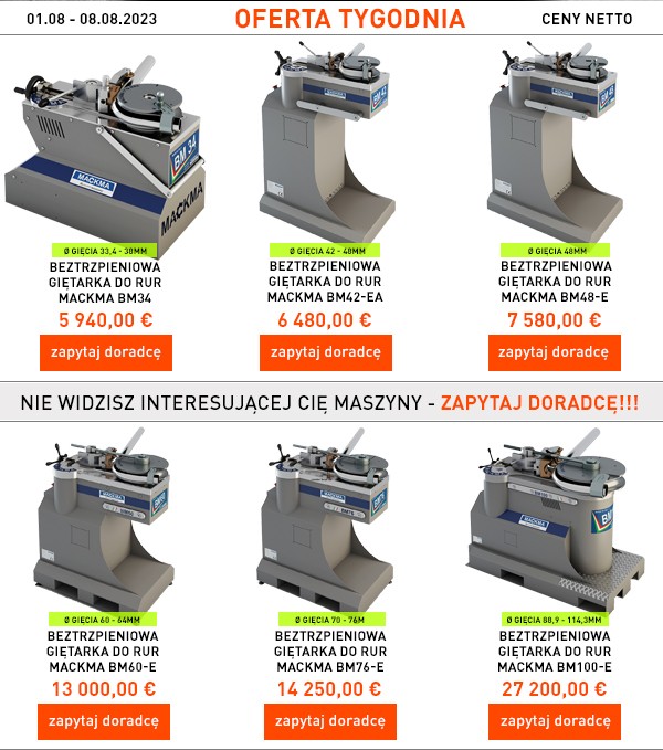 Z dumą informujemy o wyjątkowo atrakcyjnej ofercie na 6 modeli giętarek do rur i profili firmy MACKMA. Wszystkie maszyny objęte są 24 miesięczną gwarancją!!!