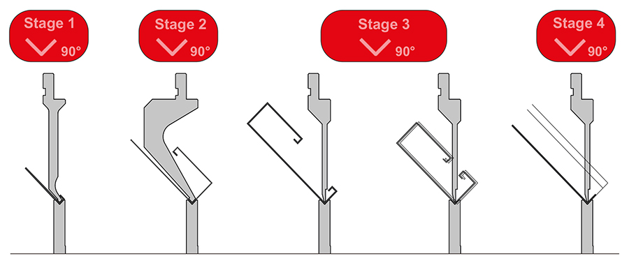 Wiele profili stempli i matryc ma wspólny skok, co umożliwia wykonywanie na jednej prasie krawędziowej etapów pod kątem 90°, etapów pod ostrym kątem, etapów zawijania i etapów offsetowych.