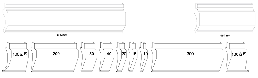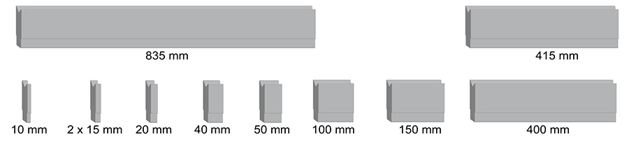 Stempel: 100; 10; 15; 20; 40; 50; 200; 300; 100 = 800 mm