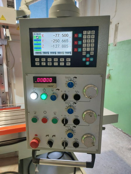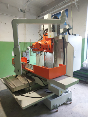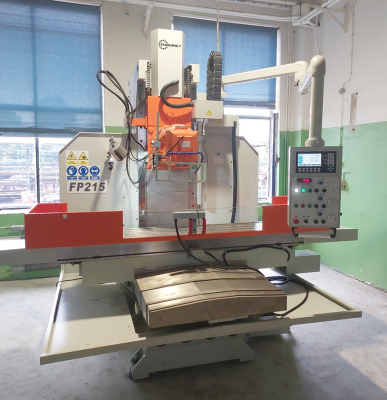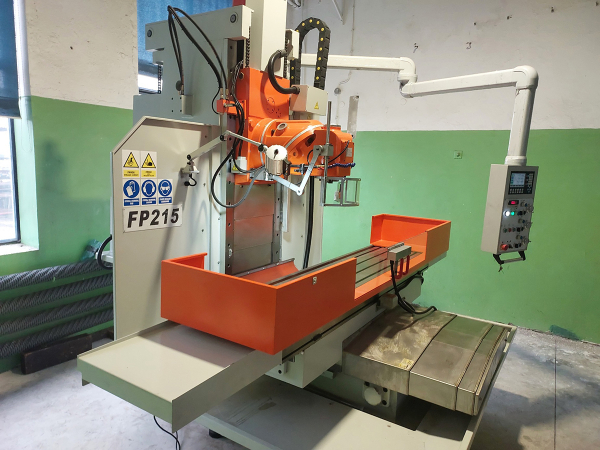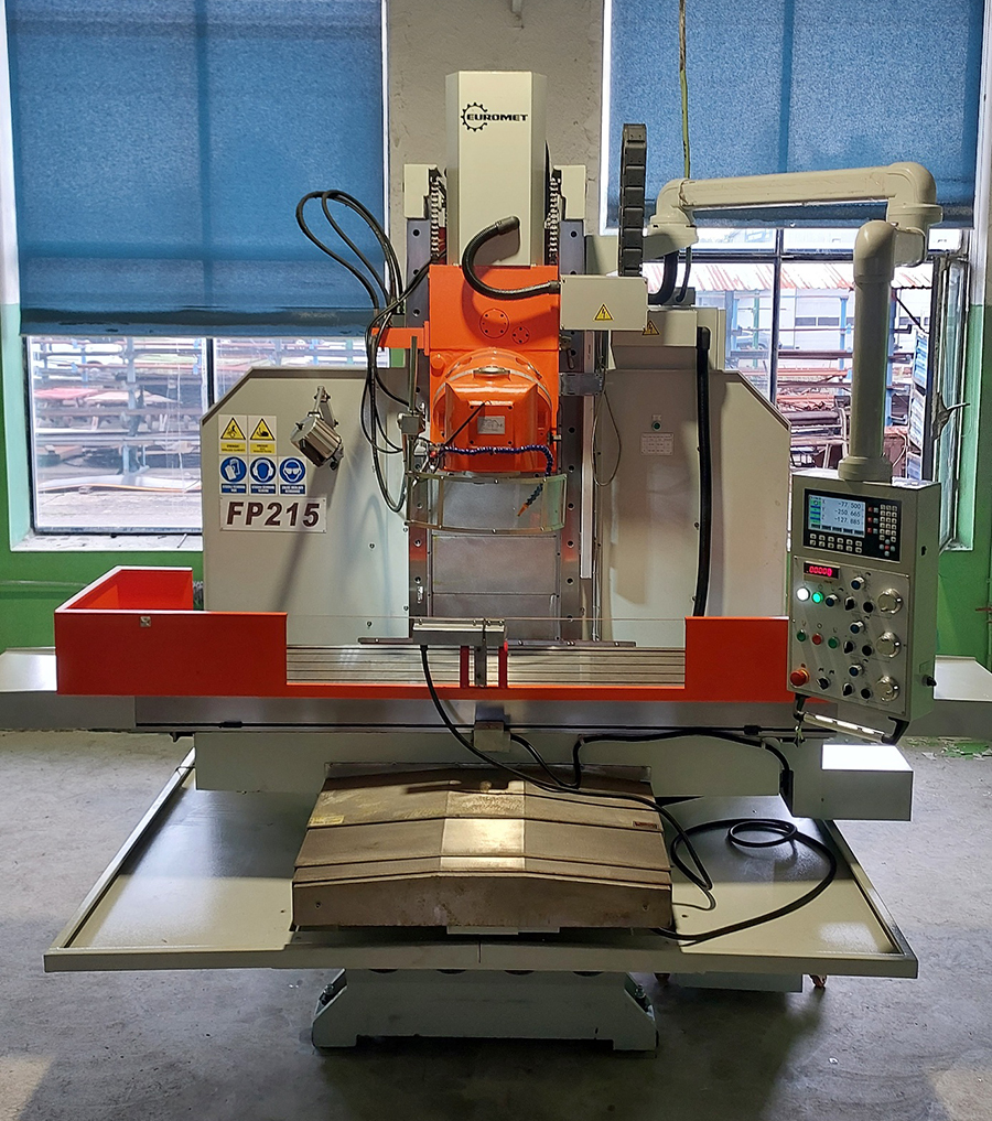 Mocna i masywna Frezarka pionowa EUROMET FP215 z dużym stołem roboczym opartym na szerokich prowadnicach prostokątnych, pracującym w osiach X, Y oraz sztywną głowicą pionową skrętną w dwóch płaszczyznach przemieszczaną po prowadnicach pionowych (oś Z) przy pomocy napędu elektrycznego.